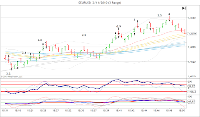 Range bars show ..the range much better than candlesticks. 4,9 easy pips here, just by putting a buy order above the rectangle. BUT, if I wanted more, I would be kicked off with a loss. That is the edge of the scalper : he needs a few pips only, he is modest. Otherwise, he's lost.